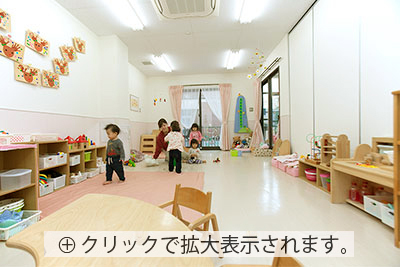 1〜2歳児のお部屋です。手作りおもちゃや発達を促すための遊具を揃えています。自分で選べる遊びのコーナーも子どもたちに人気です。お日様がいっぱいの明るいサンルームにつながっています。