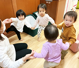友達と手をつなぎ、楽しそうに横に揺れ、 「♪どっし~ん」と言うと皆で合わせてしゃがむ姿に笑顔がこぼれます。
