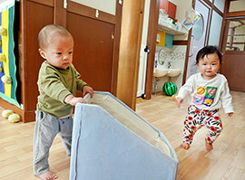 保育教諭が「♪おらうちの~どてかぼちゃ~」 とわらべ歌を歌い出すと、