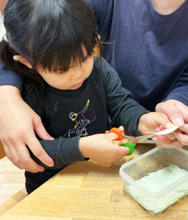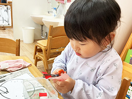 手元をよくみて、はさみは真っ直ぐに持って「切る」という動作を意識して、